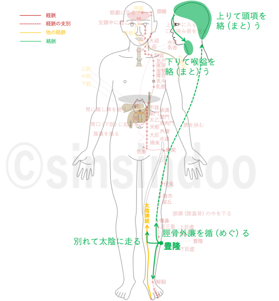 足陽明之別.名曰豐隆.去踝八寸.別走太陰.其別者.循脛骨外廉.上絡頭項.合諸經之氣.下絡喉嗌.